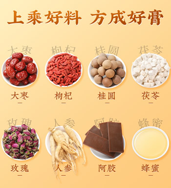 | 主要成分 | 加入八种药材:人参 阿胶 枸杞 桂圆 玫瑰 蜂蜜 大枣 茯苓 |