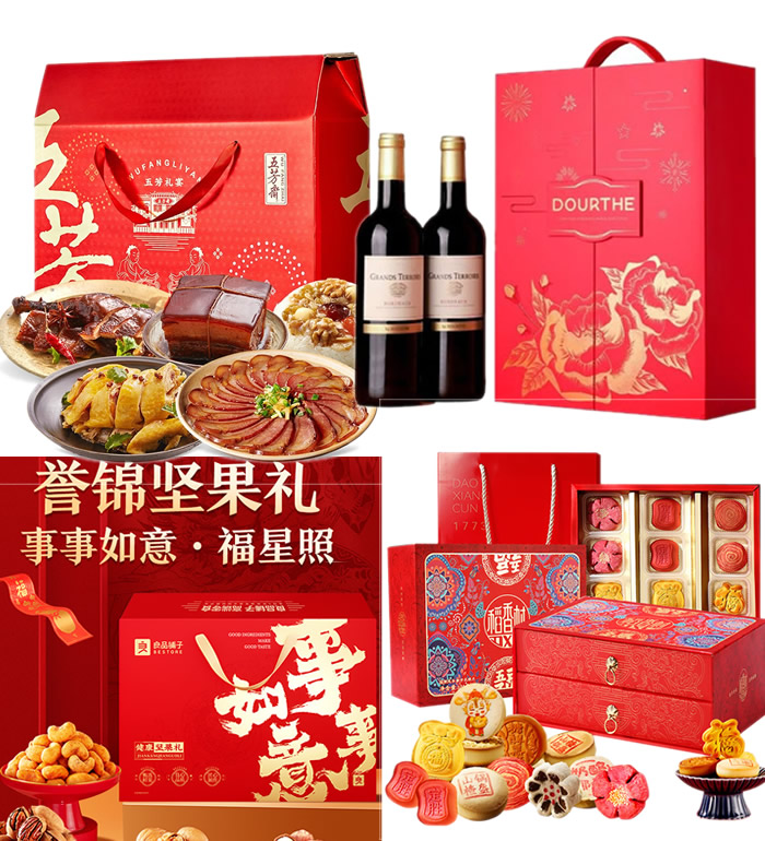红酒礼盒+卤味礼盒+糕点礼盒+坚果礼盒