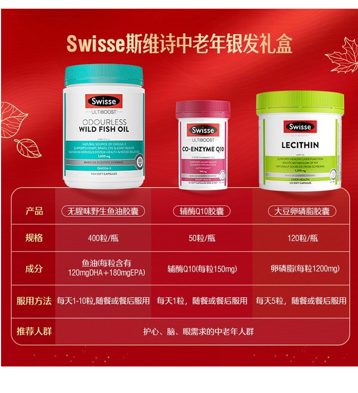 | 规 格 | 无腥味野生鱼油400粒+辅酶Q1050粒+卵磷脂胶囊120粒 |