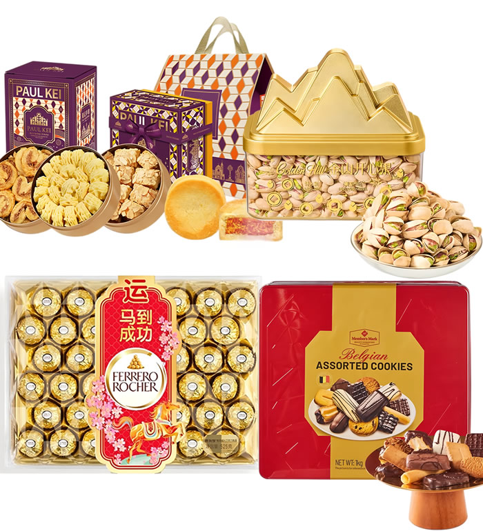 | 组 成 | 澳门葡记招牌点心年货礼包+费列罗巧克力礼盒+比利时什锦巧克力饼干礼盒+开心果创意礼盒 |